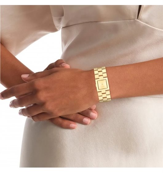 Orologio con movimento al quarzo VJ20 e funzioni di solo tempo. Cassa squadrata in acciaio inox con finitura dorata e quadrante gold dalle dimensioni di 22 mm. Cinturino in acciaio anallergico color oro. Chiusura di sicurezza. Resistente all'acqua fino a 30 metri di profondità. Appartiene alla collezione Meridian.