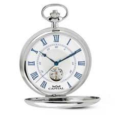 Orologio da tasca meccanico a carica manuale, tripla cassa lavorata con possibilità di incisione iniziali. Fondello con finestrella vista movimento bilanciere. Quadrante avorio lavoratocon sfere e numeri romani blu.