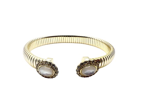 Bracciale donna in ottone ipoallergenico dorato, dettagli ovali in madreperla con corona in zirconia cubica bianca.