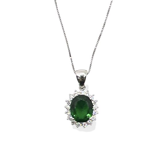 Collana donna in argento 925, pendente con zirconia cubica bianca e verde. Lunghezza cm 45. Chiusura moschettone