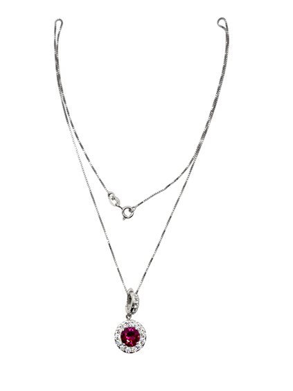Collana donna in argento 925, con pendente tondo e zirconia cubica centrale rossa. Lunghezza cm 45. Chiusura moschettone