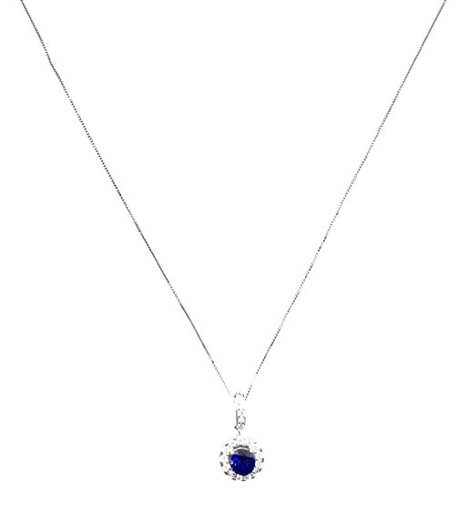 Collana donna in argento 925, con pendente tondo e zirconia cubica centrale blu. Lunghezza cm 45. Chiusura moschettone