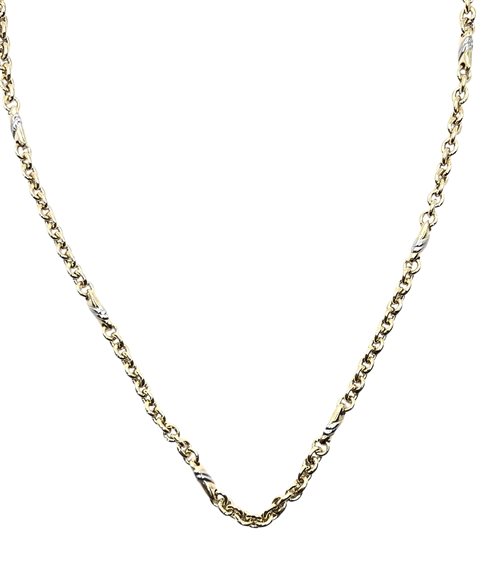 Collana unisex in argento 925 color oro giallo, maglia a catena con inserti bicolore. Lunghezza cm 60. Chiusura moschettone