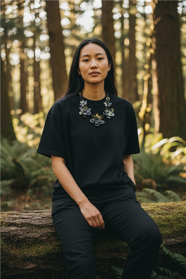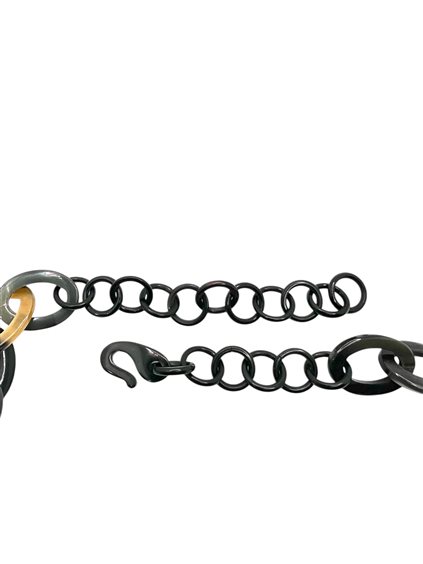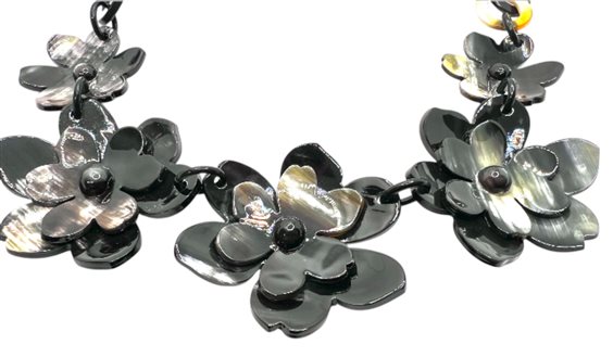 Collana donna in osso nero, grigio e beige a catena con fiori. Lunghezza 80