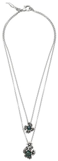 L'agata verde dona un colore profondo a questa elegante collana, costituita da due pendenti e realizzata interamente a mano in azienda. Gemme che rilucono nel prato di delicate micro-margherite d’argento brunito.